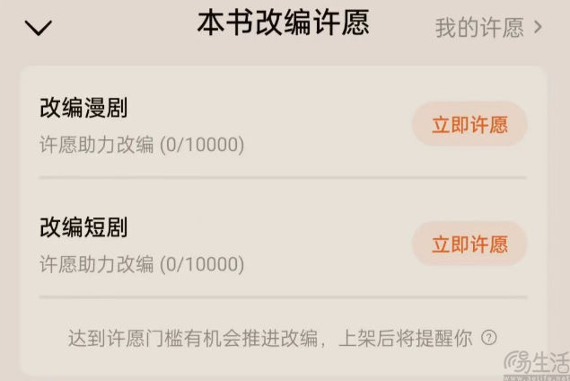 近日,番茄演义上线“本书改编许诺”功能,复旧读者集结对某网文的喜好,许诺“改编漫剧”或“改编短剧”。据了解,一部演义的许诺助力改编值满分为10000,当达到改编值门槛后,该书就有契机鼓吹改编。