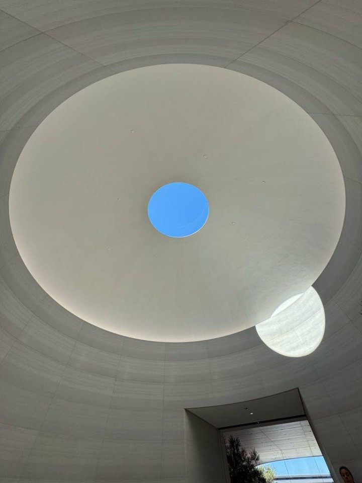 场所是 Apple Park 内一栋新落成的建筑,名叫 Observatory(天文台)。它建在园区的一处小山坡上,大地进口是穹顶造型,走进去,头顶有一个面朝天外的圆形天窗。阳光从正上方直射下来,通盘这个词空间有种神庙般的庆典感。